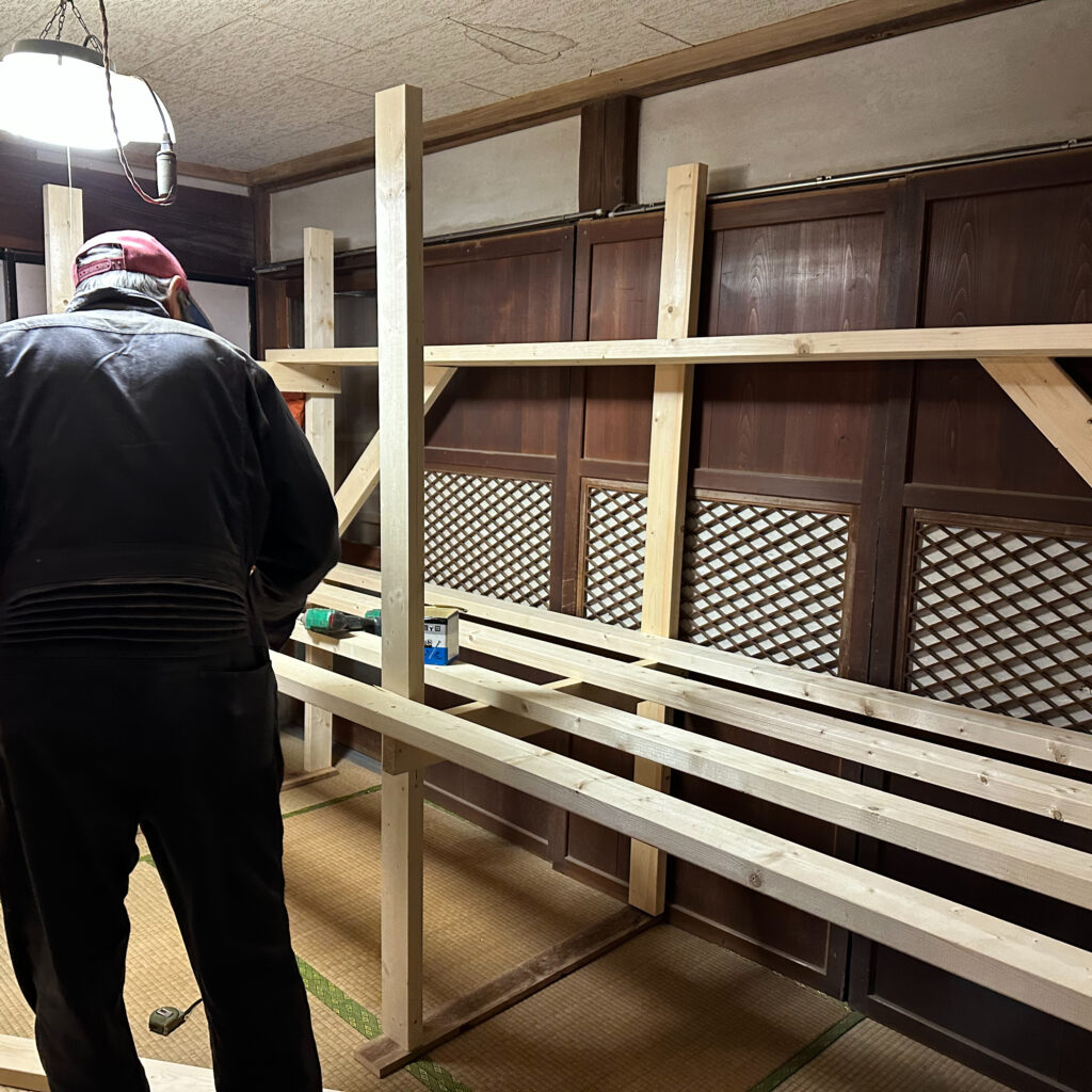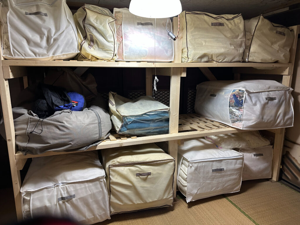 布団袋棚の作成 2026年1月18日 最終更新日時 : 2026年1月18日 YSK 旧拠点から運び込んだ布団袋の収納先がないので、廊下に仮置きしていた。何とかしなくてはと、北座敷の片隅に2x4材で棚を作って収納した。