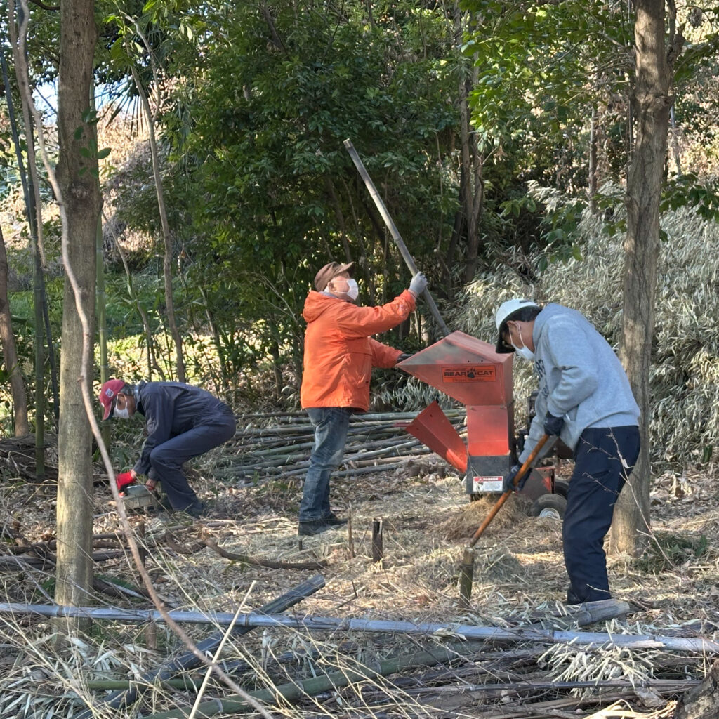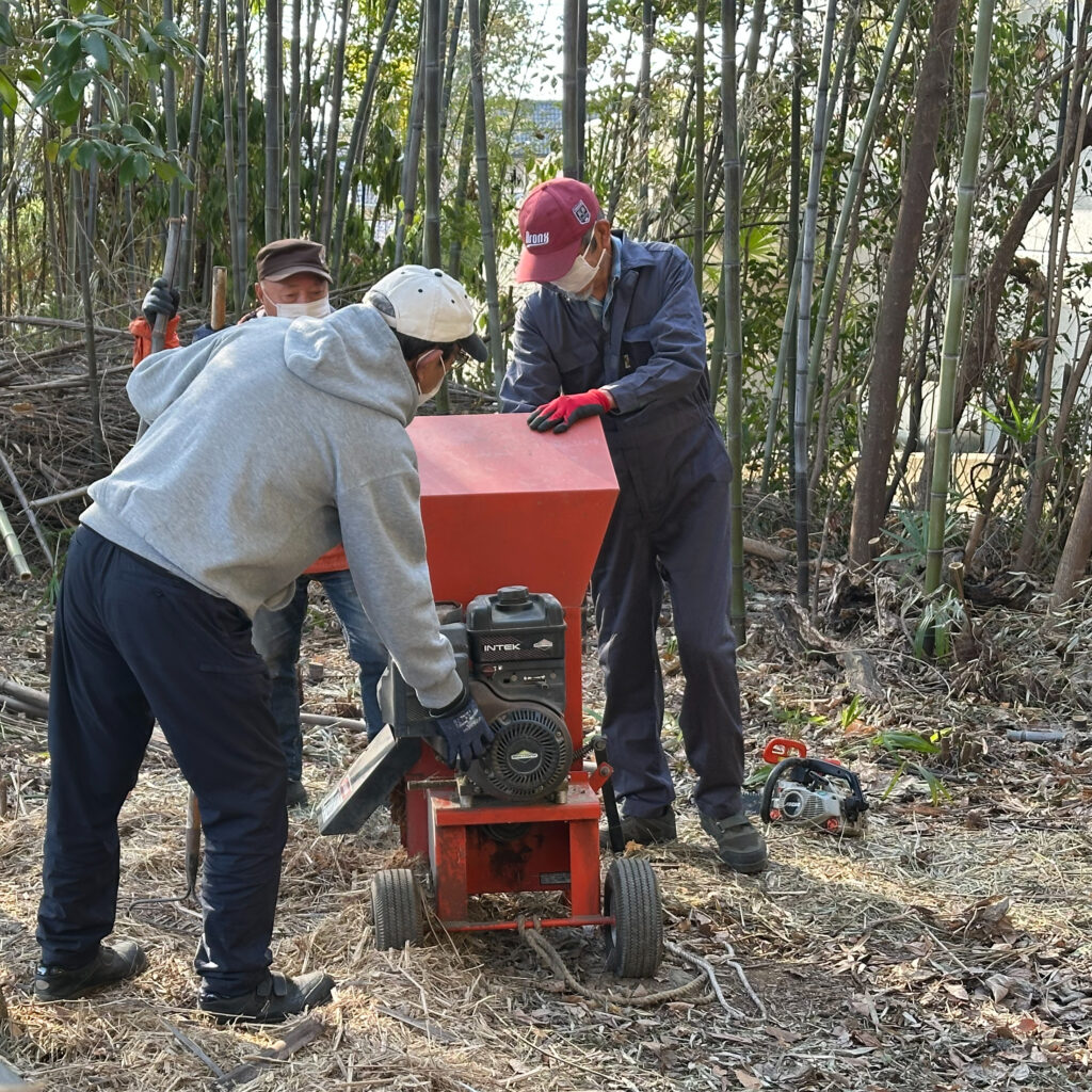 再整備で動くようになったチッパー/シュレッダーで古い伐倒竹の粉砕と新しく伐った竹を処理した。新しい伐倒竹では硬くオーバーロードのためか、Vベルトが切れてしまい、部品調達交換作業となった。いろいろ問題が発生しているが、着々ときれいな竹林に変わりつつある。