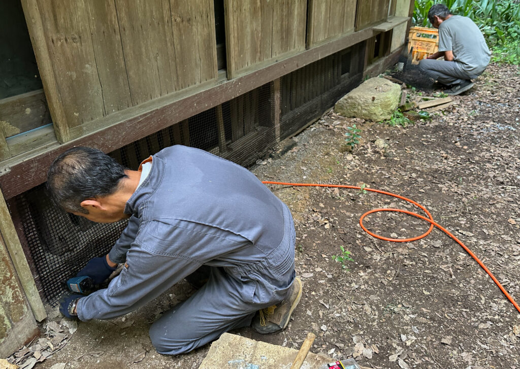 動物侵入阻止の縦桟が朽ちているので同じような板で修理しようとしたが、桟の固定先の根太も怪しく、プラメッシュで塞ぐことにした。固定にはカヌーづくりで使う強力タッカーが威力を発揮、固定位置を自由に選べるのでしっかり固定できた。