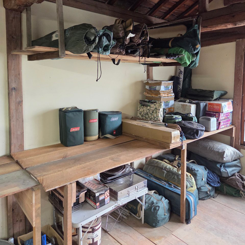 納屋二階に吊り下げ式追加棚の設置。アウトドア用品が整理されて置けるようになってきた。