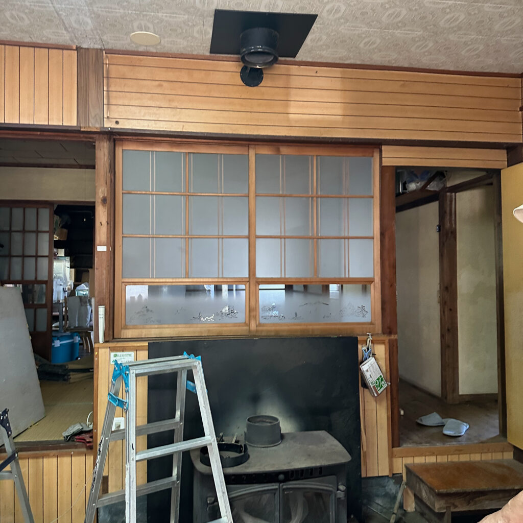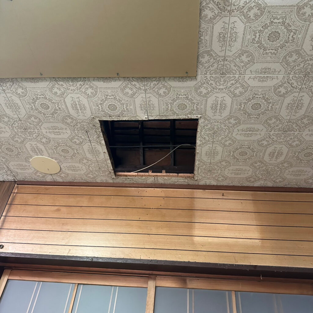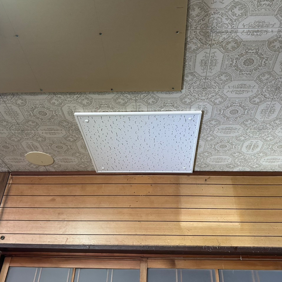 撤去後は室内側煙突貫通穴は追加ボードで塞がれた。