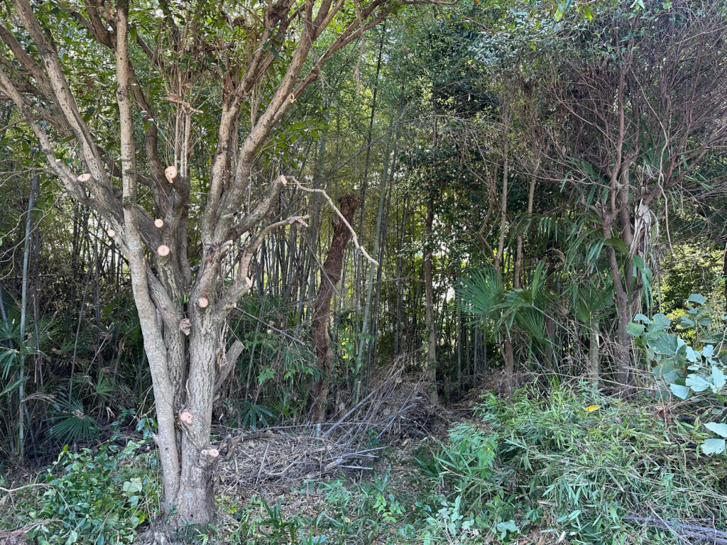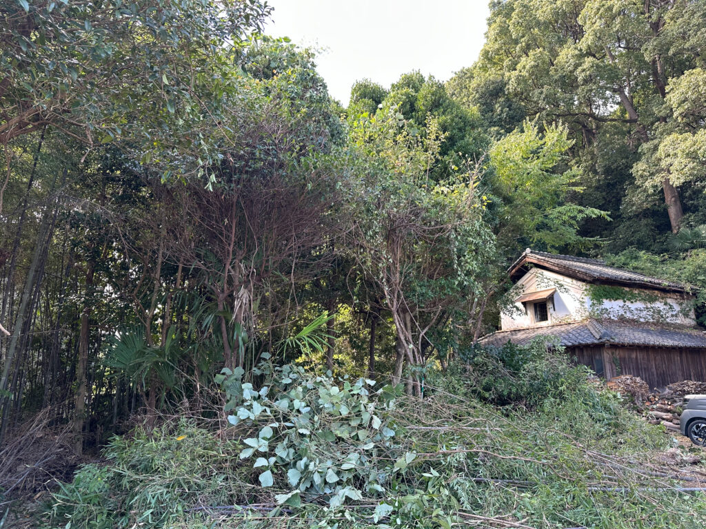 庭の西側にある庭木の梅と金木犀を中心に強剪定(いわゆるブツギリ)と間伐・伐倒作業をおこなった。カラスウリとクズの蔦で覆われてマント群落となってしまっており、林内は見えず、上に枝葉が伸びて下層の枝は枯れてきており手に負えない状態。やっと土蔵付近まで見通せる状態になった。きれいにするには先が長い。
