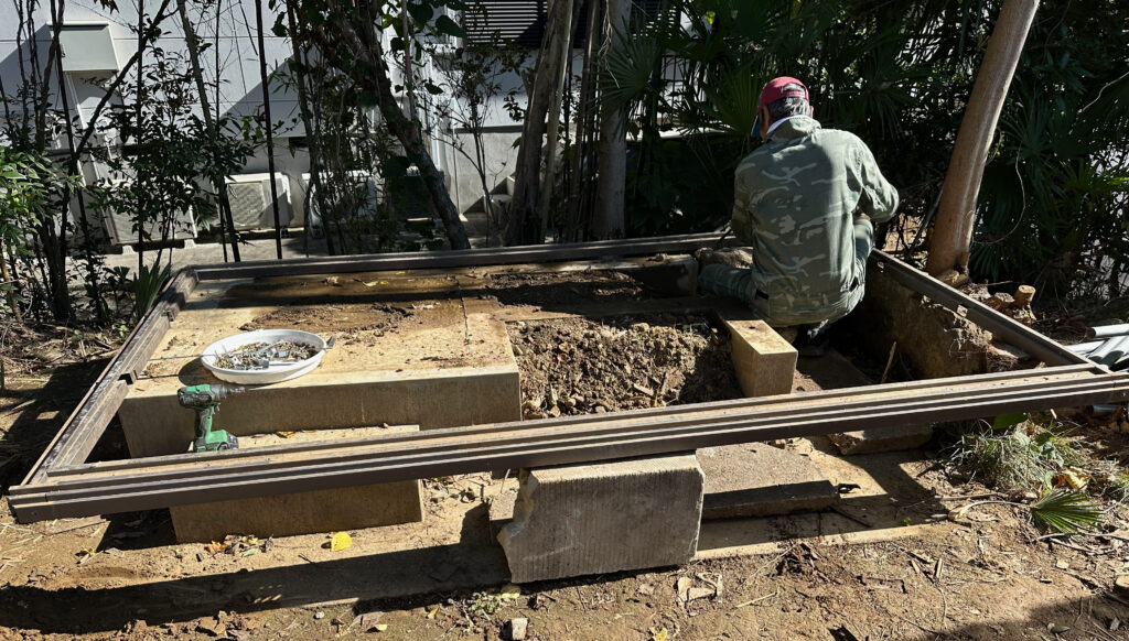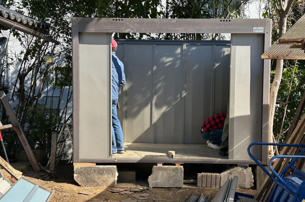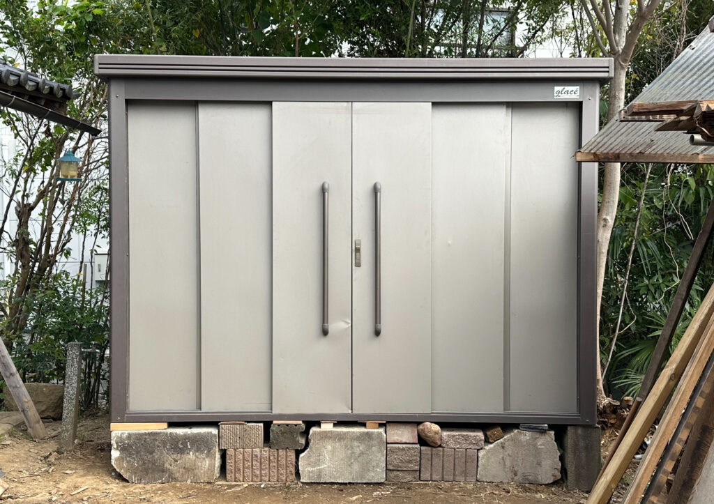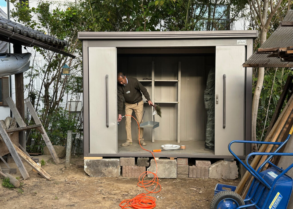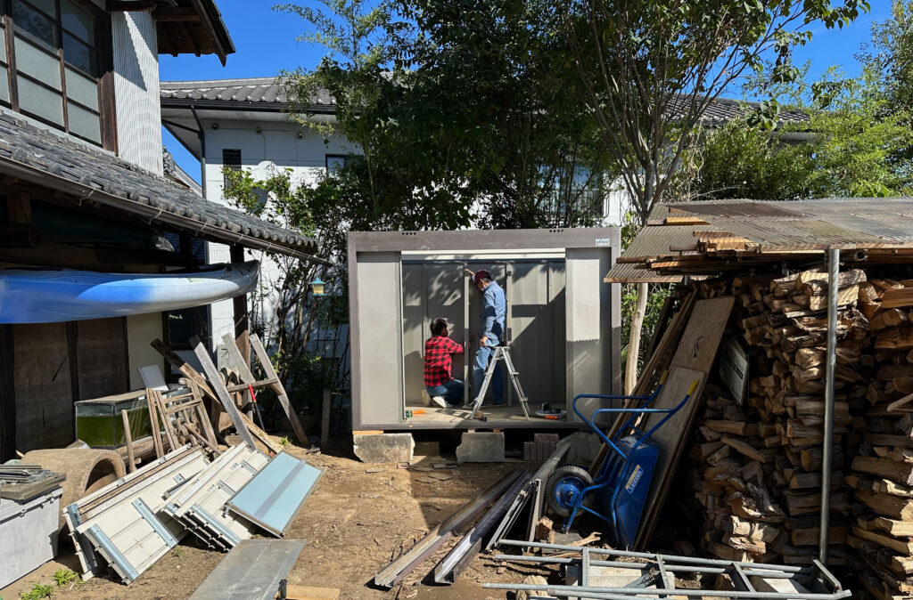 プレハブ倉庫の設置 2025年10月28日 最終更新日時 : 2025年10月28日 YSK 外厠の土台を使った倉庫の土台拡張工事が始まった。まずは倉庫外枠を置いて、水平だしと追加土台の設定から。 壁まではすんなり進んだが、屋根がパズルとなり迷宮入り。桁の方向性があることが試行錯誤の結果分かった。(組立説明書なし!) 綺麗に清掃、エアブロウ
