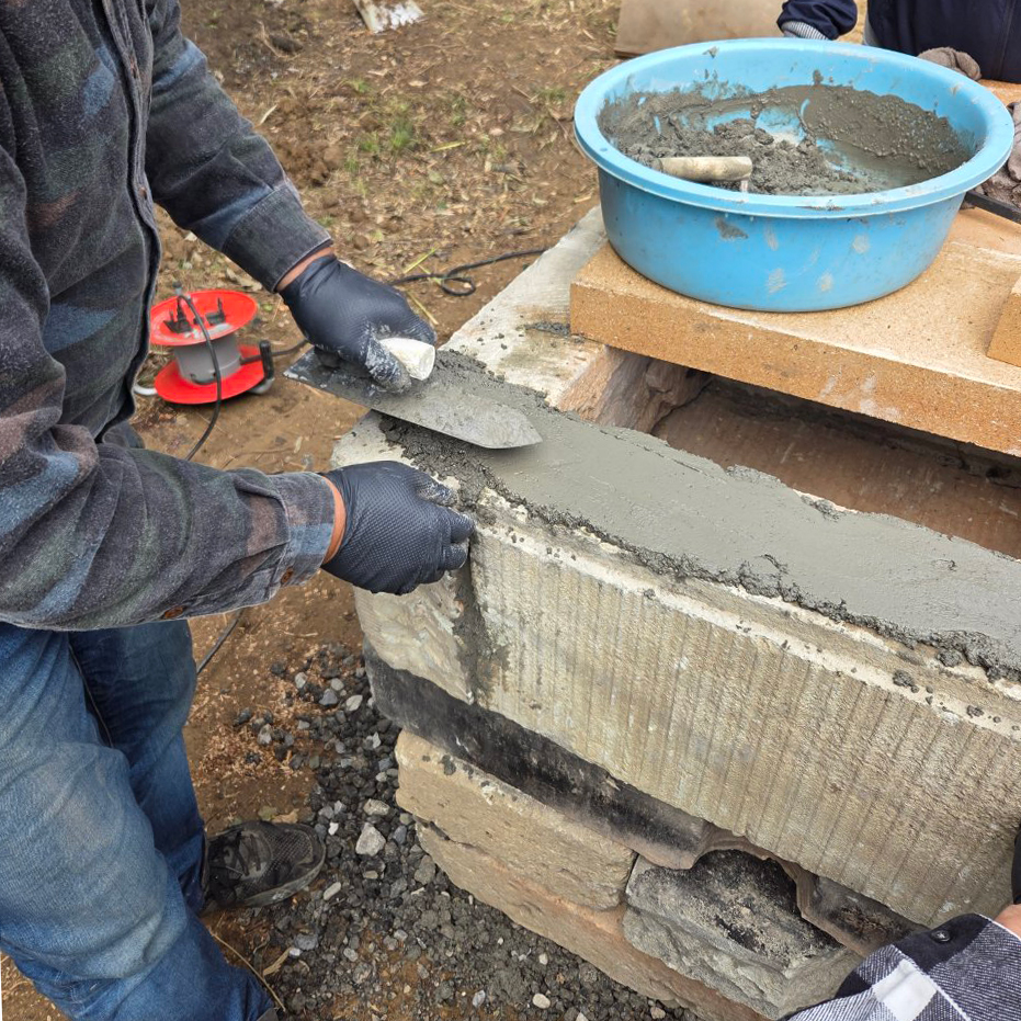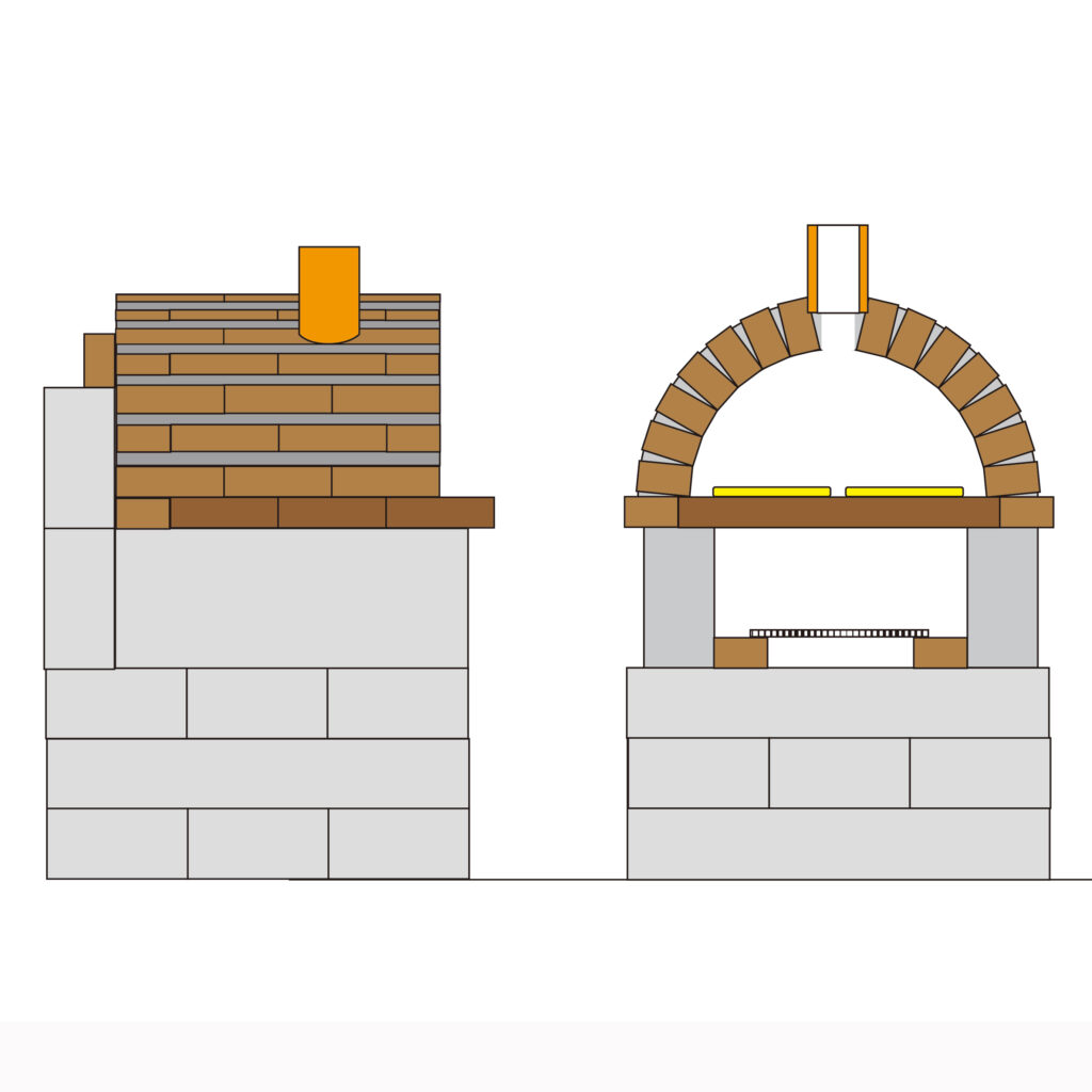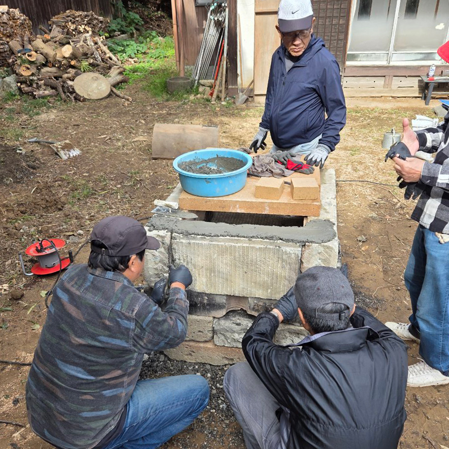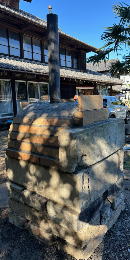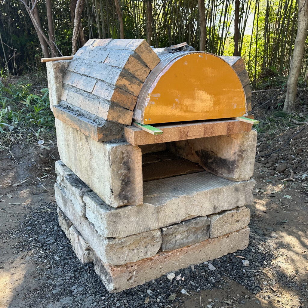 比企自然学校内での検討デザインに基づき、図面を起こして工事は進む。大谷石は前のピザ窯の解体再利用品。耐火煉瓦はホームセンター調達。同様に調達したインスタントモルタルは約30kg使用。それなりに見栄えのする窯が出来上がった。