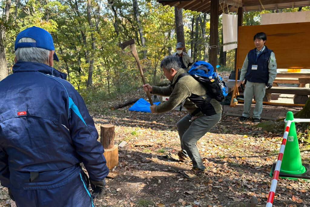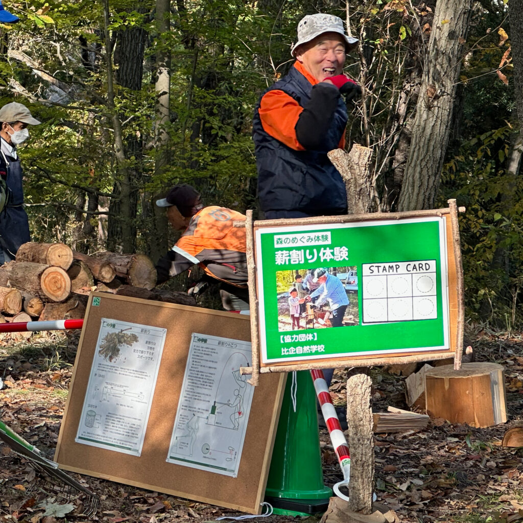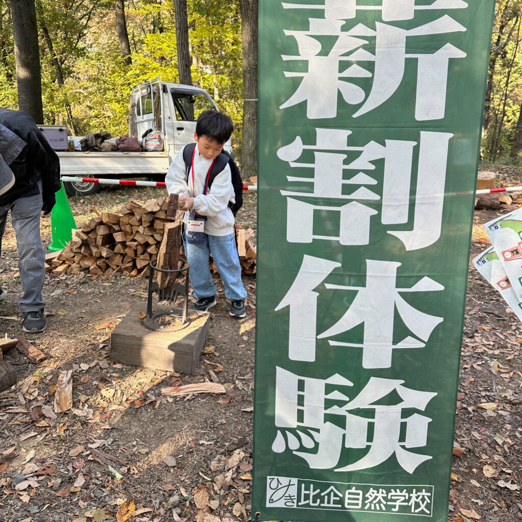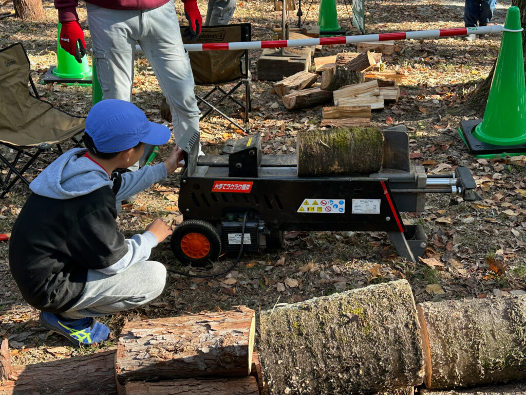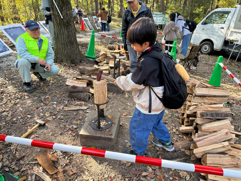 自然学習ウォーキング「市民の森であそぼう」に森のめぐみ体験コーナーとして「薪割体験」で参加した。小さなこどもたちでも簡単に薪割りできる油圧薪割り機のレバー操作、その大割の薪を細かく割るキンドリングクラッカーが今回のセットメニュー。おとうさんたちには斧の薪割。こどもたちにかっこいいおとうさんを認識させる機会になったようだ。