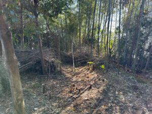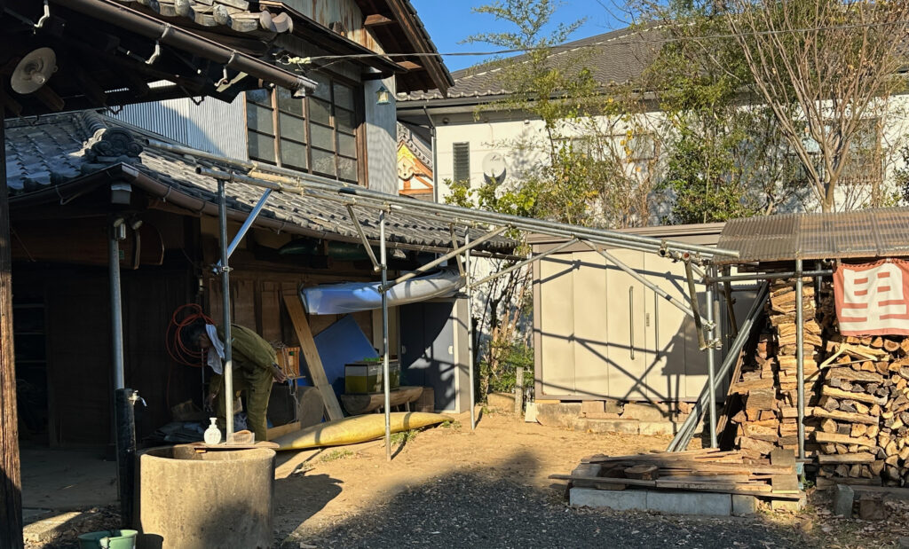 プレハブ倉庫とのアクセス、および作業スペースの確保から単管で屋根フレームをつくった。屋根サイズのシートがないので今日はこれまで。