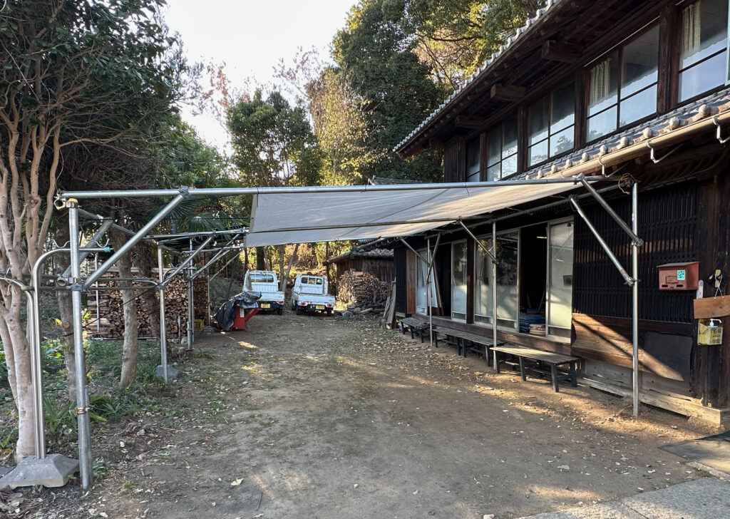 縁側から見て、シートが明るい分圧迫感はない。単管の無粋さは目をつぶろう。