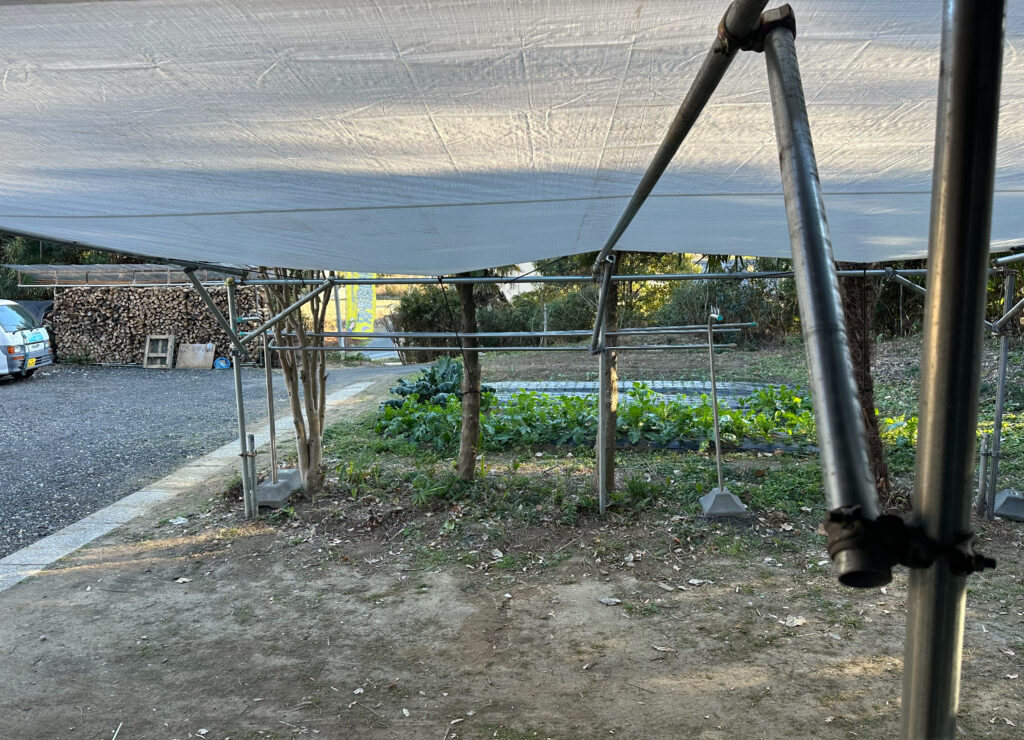 今までは必要都度シートを張っていたが、きちんとしようということで、前庭のスペースに単管でフレームを作りシートを張った。これで各種イベントの雨天対策は可能となる。また、いちいち貼り手間が省ける。問題なのは雪、その時は外して凌ぐしかないだろう。