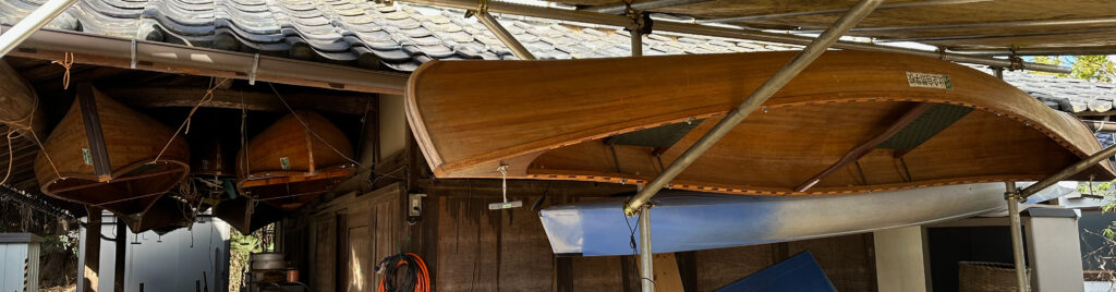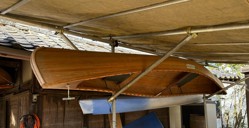 従来からの納屋下吊り下げ収納とのハーモニー。6艇がきちんと格納された。