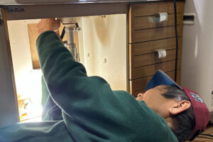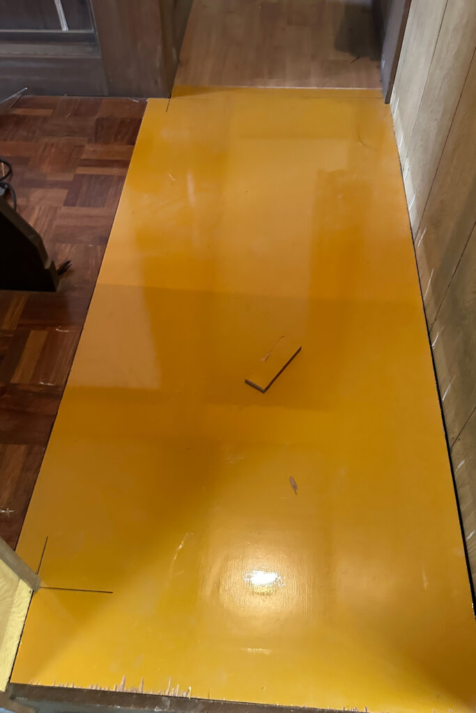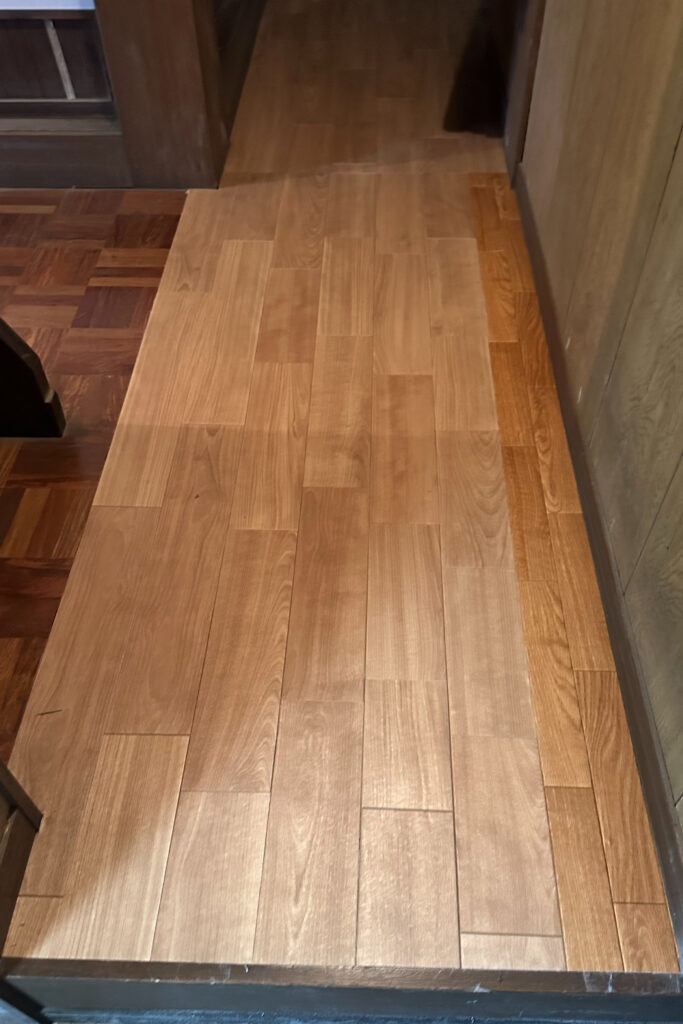 廊下の床は一部ふわふわ状態だったので、その部分のみ根太の補強と張り替えを行なった。仕上げは余った材料のパッチワーク。やっと一階部分の床はすべて綺麗に作り直しが完了となった。これで安心して歩ける。