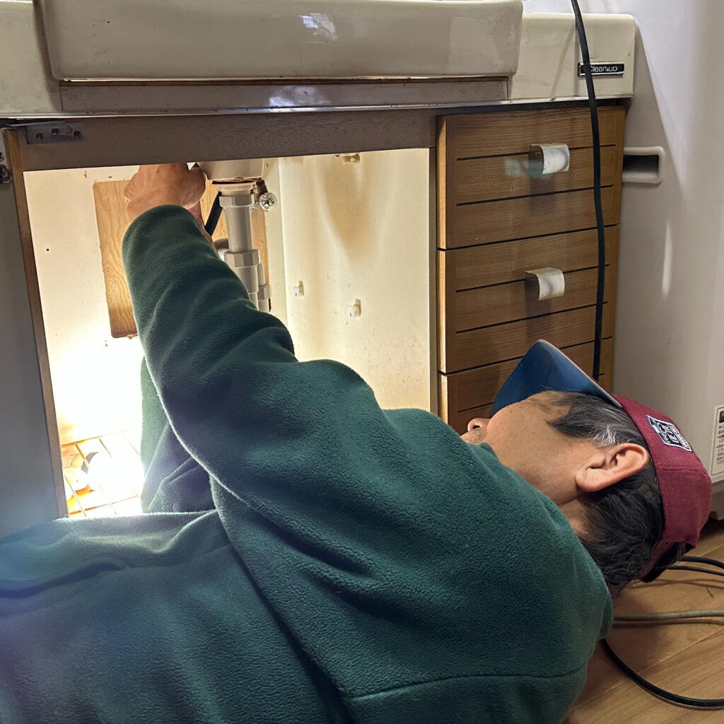 床作業で一度外し修理した洗面台の水配管はその後配管表面にじんわり水が滲んでおり、注意深く確認したところ、修理した反対側差込み接続部からが原因とわかり、結局配管ごと交換することに。作業スペースがなく、なかなか手強い。