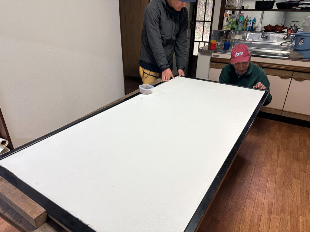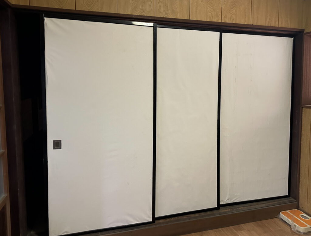襖(ふすま)張り 2026年2月11日 最終更新日時 : 2026年2月11日 YSK 建国記念日、早朝より「給湯器から水が噴出」急報が届き駆けつける羽目に。先日の雪で冷え込みが厳しくなり凍結が原因の事態。駆けつけたついでに人が集まったので作業開始。 台所と同じ壁紙で仕上げた。立て付けが問題。その調整に時間がかかる。 張りたてで多少のシワが目立つが、ずたずただった状態からは脱した。乾いてハリが出てシワがなくなる状態を期待。 午後は残ったメンバーで簾戸(?)にある障子紙剥がし。