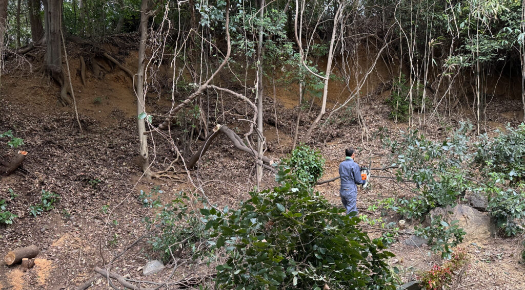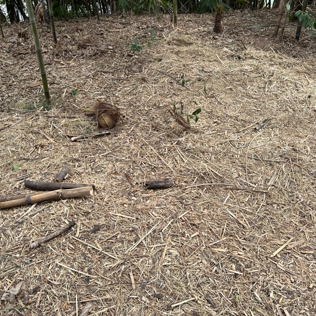 間伐のため途中から伐倒し杭のように残ったタケが乱立している状態だったので、邪魔にならないように根本からひとつひとつ取り除いた。今度はシュロの幼木がたくさん残り、この始末に翻弄されている。それにしても中を歩ける普通の(?)竹林になった!
