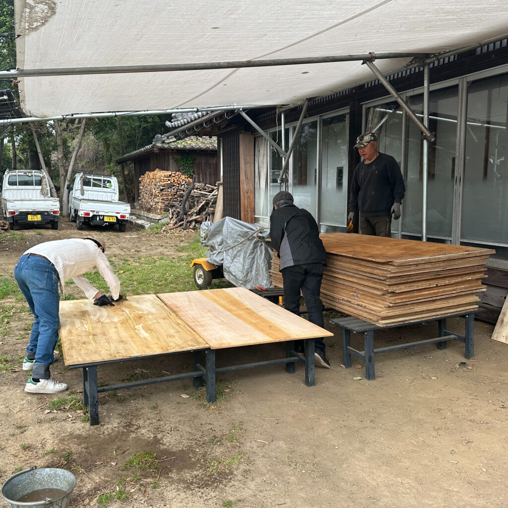 二階床用下地材の乾拭き、雑巾掛けを行い、綺麗にしてこれからの作業の準備を行なった。開放空間の屋根の下にあったものなので、綺麗に見えても雑巾で拭き取ると結構汚れが取れた。