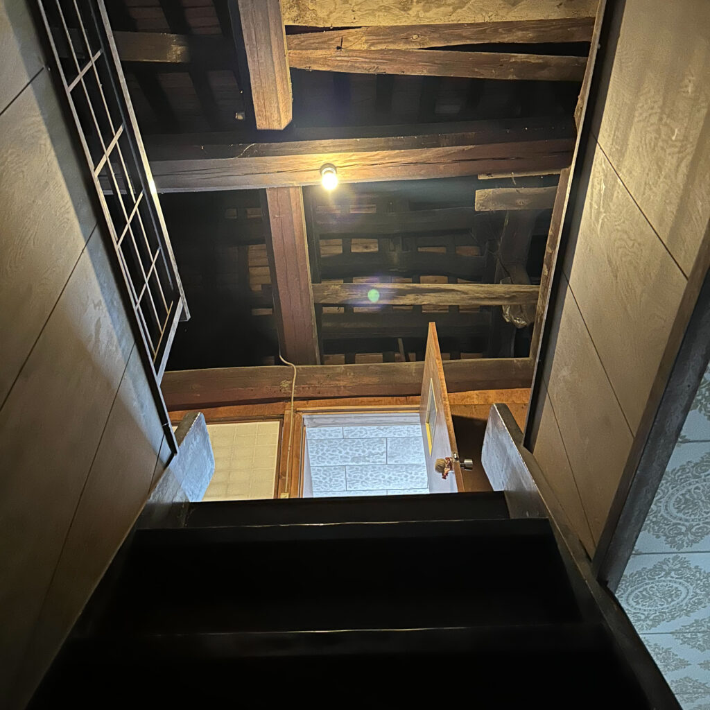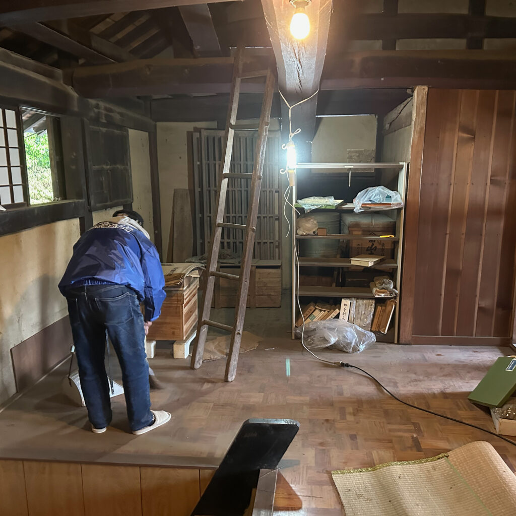 急な階段を登ると梁むき出しの旧蚕室。埃を被った品々があちこちに置いてあるので、まずは片付けながら床清掃。この急階段からものを運び出すのは至難の業。断捨離判断をするわけにはいかないので、なるべくそのまま隅に寄せて二階保管のうえで空間確保という方針にして作業した。