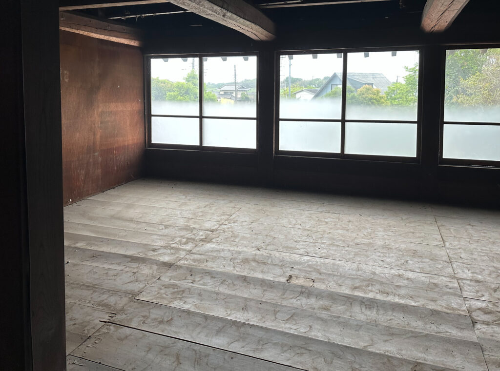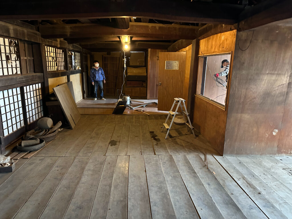 床板は経年変化により板間に隙間ができているのと、釘の腐朽で保持力がなくなり反っている。床づくりの先は長い。